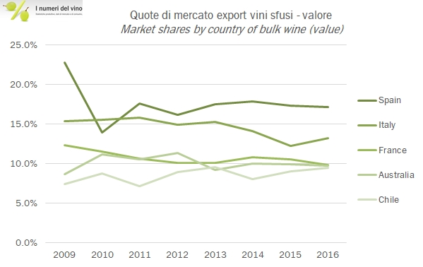 - La Spagna resta il primo esportatore, con un volume di 12.7 milioni di ettolitri e un valore di poco meno di 500 milioni di euro, in calo del 2% e del 10% circa sotto il record toccato nel 2013 (550 milioni di euro ma con molto meno volume).