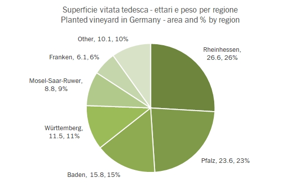 • Dal punto di vista geografico invece la sitazione è del tutto stabile. Non ci sono aree in particolare crescita o calo nel 2016. La regione Rheinhessen continua a rappresentare con 26600 ettari il 26% del totale. La torta allegata vi fornisce tutti i dettagli.