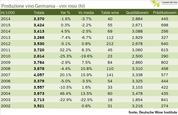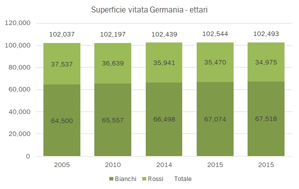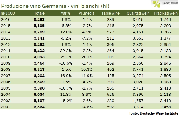 • Lo “scatto” dei vini di qualità tedeschi è tutto improntato sui vini bianchi, dove a fronte di una produzione di 5.4 milioni di ettolitri, soltanto 3.6 milioni sono “di qualità” rispetto a una quota molto maggiore per i rossi (2.9 milioni di ettolitri sui 3.3 totali). Nel 2016, questi 3.6 milioni di ettolitri sono il massimo dal 2008 a questa parte, quando però la produzione di vino fu di 10 milioni di ettolitri e quella dei vini bianchi oltre 6 milioni.