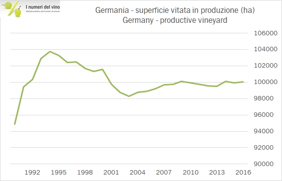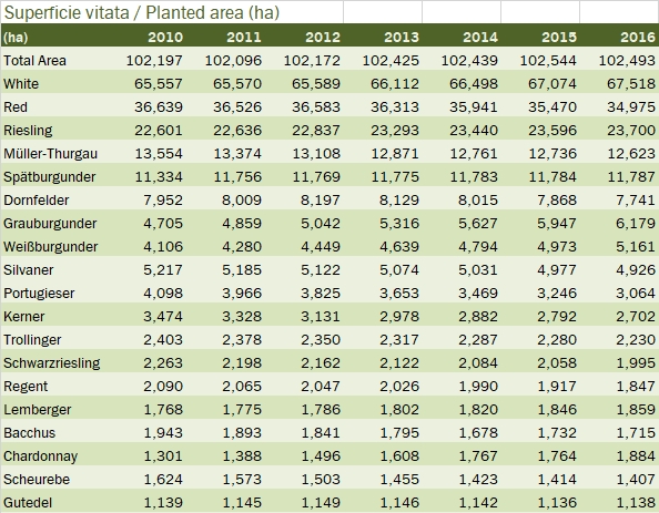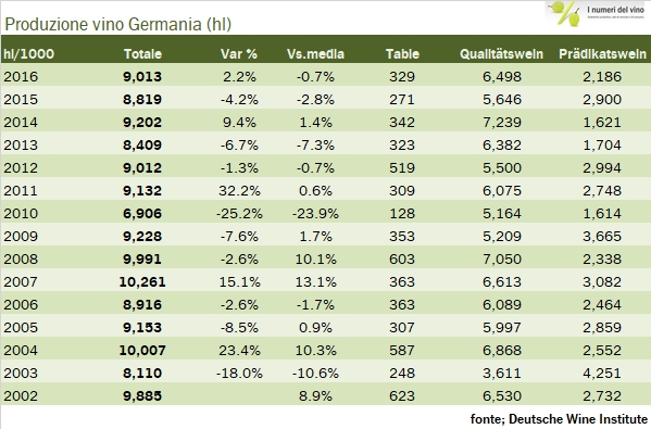 • La produzione di vino 2016 è stata in perfetta media storica e in crescita del 2% rispetto al 2015. Sono sopra media i vini di qualità, 6.5 milioni di ettolitri, +15% e 8% sopra media, mentre calano del 15-20% sia i Prädikatswein che i vini da tavola, rispettivamente a 2.2 e 0.3 milioni di ettolitri.