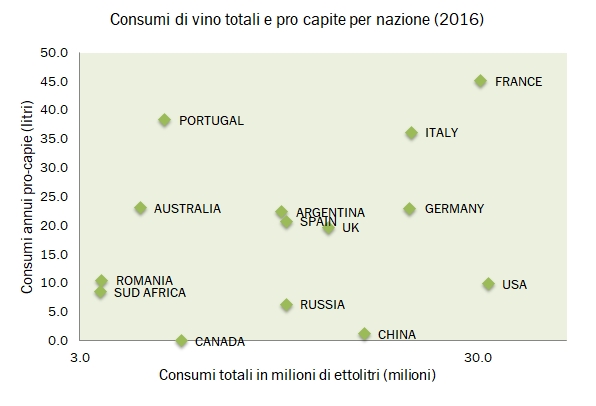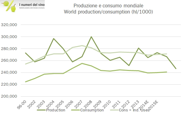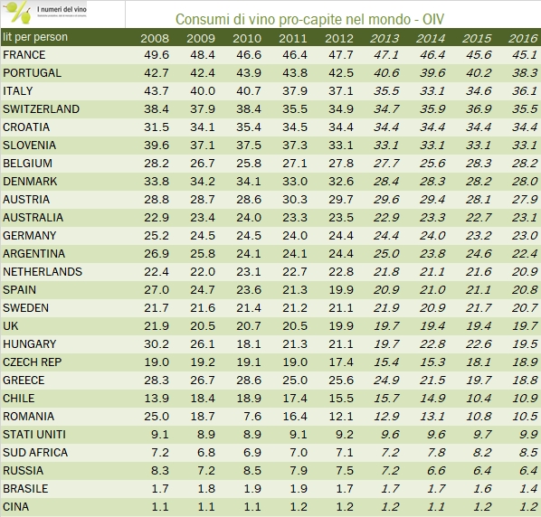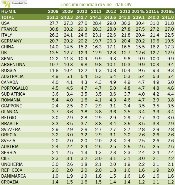 - Secondo OIV i consumi mondiali di vino nel 2016 sono stati 241 milioni di ettolitri, 1 milione in più del 2015 (240 milioni) ma circa 3 milioni meno di 5 anni fa e circa 6 meno dei 247 milioni stimati nel 2006.
