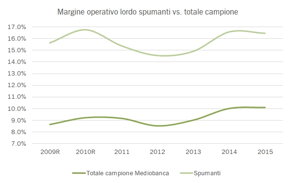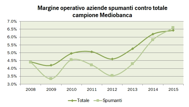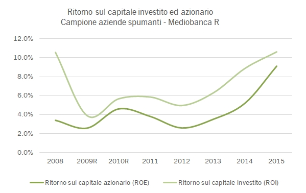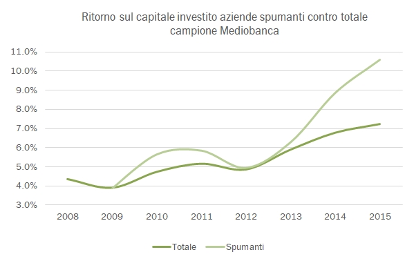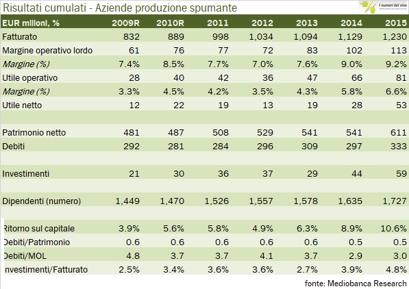 Sappiamo tutti quanto i produttori di spumanti stanno cercando di “de-festeggiare” il prodotto per aumentargli le opportunità di consumo. I dati che presentiamo oggi però sono “da brindisi”. Stiamo parlando dei dati finanziari aggregati delle 31 principali aziende produttrici di spumante, che sono isolate dal rapporto Mediobanca. I dati sono purtroppo relativi al 2015 (l’aggiornamento 2016 sarà disponibile solo ad aprile 2017), ma rendono l’idea della crescente divaricazione tra i risultati del settore in generale e quelli del segmento. Se fino al 2012-2013 i risultati erano in qualche modo sovrapponibili (vista la forte esposizione del segmento al mercato italiano fino a quel momento), dal 2014 le cose sono cambiate, grazie a un contributo ben più importante delle esportazioni. Due o tre dati. Nel 2015 il ritorno sul capitale delle aziende spumantistiche supera il 10% contro la media del 7% del settore (9% se escludiamo le cooperative); fatto 100 il fatturato 2008, nel 2016 (il fatturato è “avanti” di un anno rispetto agli altri dati) queste aziende sono a 162 contro il settore a 141. Un successo peraltro destinato a continuare, vista la forte crescita del 2016, e del 2017, delle esportazioni (ma anche i dati comunque buoni in Italia), anche se bisognerà valutare in che modo il forte incremento dei costi delle materie prime nel comparto del Prosecco impatterà i risultati finanziari. Ma per ora focalizziamoci sull’analisi di questi dati.