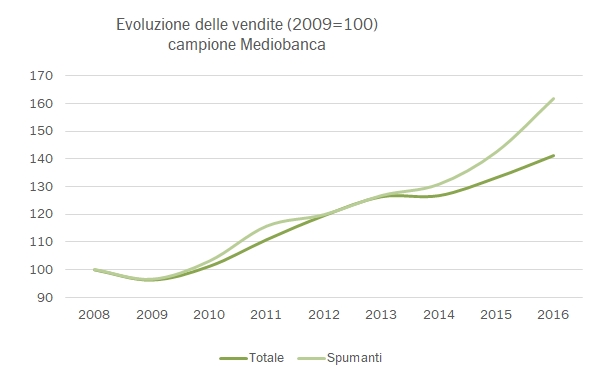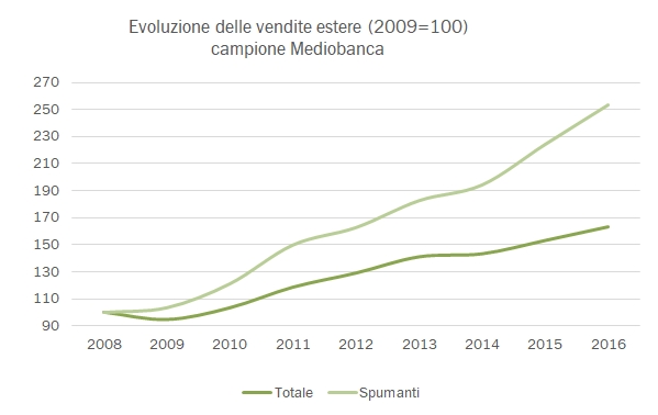 - Nel 2016 le vendite di queste 31 aziende focalizzate sugli spumanti sono salite del 14% a 1.4 miliardi di euro, grazie a un incremento del 13% delle vendite estere (611 milioni) e del 14% di quelle in Italia (786 milioni). Come potete notare la relazione Italia/estero è qui ancora invertita, anche se non è una situazione destinata a durare a lungo.