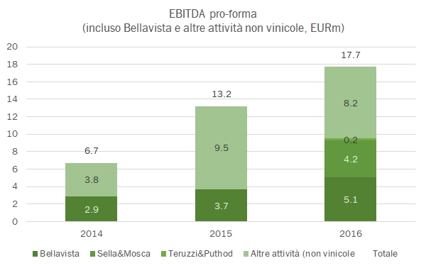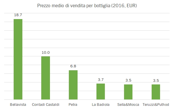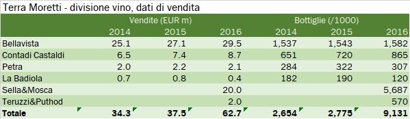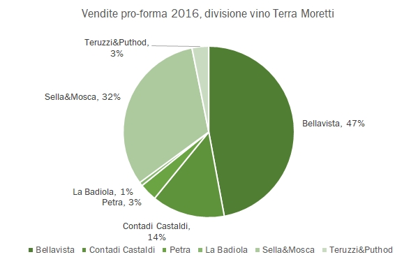 - Se guardiamo alla divisione vino nello specifico, nel 2016 Bellavista ha realizzato il 47% delle vendite proforma del segmento vino, quasi 30 milioni per 1.6 milioni di bottiglie vendute e un prezzo medio di vendita molto elevato di 19 euro a bottiglia. Con Contadi Castaldi e Petra rispettivamente al 14% e 3% del fatturato vino si completa l’ “alto di gamma” di Terra Moretti, cui si innestano le acquisizioni da Campari, che cubano il 35% del fatturato con un prezzo di vendita decisamente inferiore, di 3.5 euro a bottiglia.