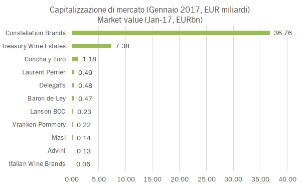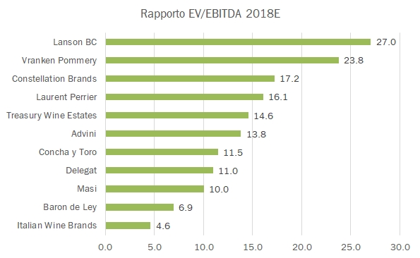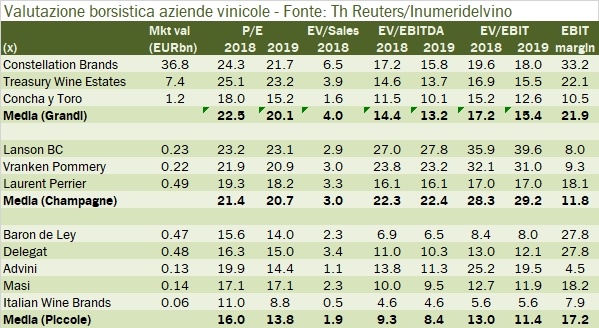 - Per la valutazione del settore prendiamo quest’anno in considerazione 11 aziende, divise in tre truppi. Le grandi: Constellation Brands, Treasury Wine Estates e Concha y Toro. Le tre dello Champagne: Laurent Perrier, Lanson BCC e Vranken Pommery. E infine cinque piccole aziende (tutte sotto i 500 milioni di euro di valore di mercato) che comprendono la spagnola Baron de Ley, la neozelandese Delegat, la francese Advini, e le due italiane Masi e Italian Wine Brands.