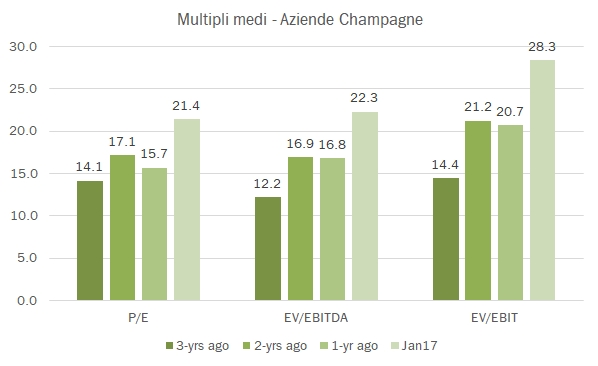 - Le aziende della Champagne hanno ormai valutazioni che sono fuori dai canoni classici, a causa del calo degli utili che hanno registrato, cui non corrisponde un calo della loro valutazione di mercato. Quindi i multipli si espandono su valori “incomprensibili” di 28-29 volte il rapporto tra valore d’impresa e utile operativo. Mi fermerei qui perché siamo in un campo che non è confrontabile con quello delle nostre aziende vinicole.
