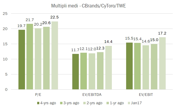 I record raggiunti a fine anno dalle borse mondiali (non da quella italiana, chiariamo subito) si ribattono favorevolmente anche sulle valutazioni delle aziende vinicole. Come ogni anno facciamo il punto su quanto valgono e come si sono mosse le valutazioni dei principali titoli quotati del settore. Ebbene, conclusione più evidente è che rispetto a un anno fa di questi tempi le grandi aziende vinicole valgono il 10-15% in più se guardiamo i tre principali indicatori che prendiamo in considerazione (prezzo/utili, e valore d’impresa su EBITDA e utile operativo). Nel caso delle aziende della Champagne come vedrete le variazioni sono ancora più importanti, ma qui entra in gioco il fatto che gli utili di questi operatori sono calati mentre le valutazioni sono cresciute insieme al valore del loro magazzino… insomma dire che la valutazione è salita di oltre il 30% sarebbe un po’ fuorviante per chi legge… comunque, il quadro è positivo: le grandi aziende vinicole mondiali (tre) trattano a circa 22 volte gli utili attesi 2018, quelle piccole che comprendono anche le nostre Masi e Italian Wine Brand sono a 16 volte. Se guardiamo invece al valore di impresa su EBITDA siamo rispettivamente a 14 e 9 volte circa. Passiamo all’analisi dei dati.