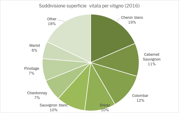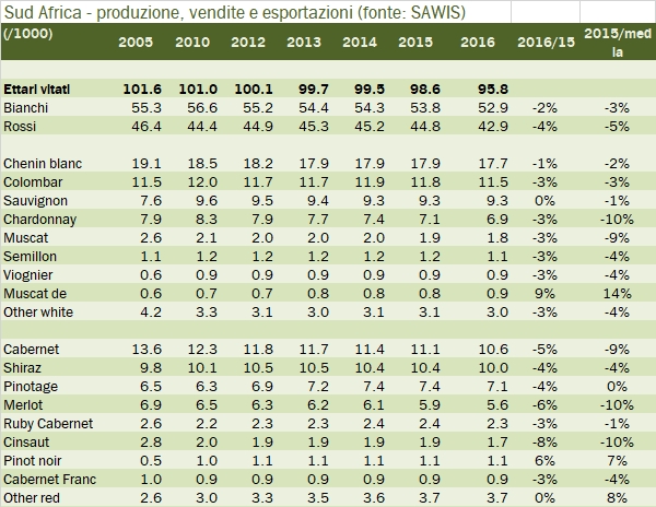 - Infine, è molto interessante vedere come si sta evolvendo la superficie vitata, che si attesta a 96mila ettari, -3% rispetto al 2015, con un calo del 2% dei vitigni bianchi e del 4% dei vitigni rossi a 53mila e 43mila ettari rispettivamente. Andando nel dettaglio per vitigno, che trovate allegato in tabella, trovate che solo il Sauvignon Blanc tra i vitigni bianchi importanti è stabile (cresce il Moscato ma è poco rilevante), mentre è da notare il calo molto pesante del Cabernet Sauvignon tra le varietà rosse e dopo diversi anni di crescita anche del Pinotage. Resta unico vitigno rosso in crescita il Pinot Nero, come anche in tanti altri posti del mondo…