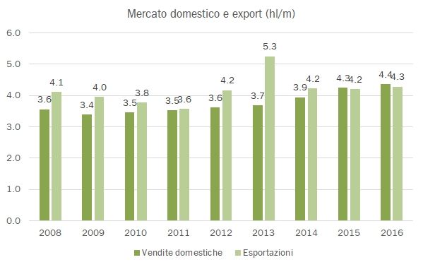 - In termini di vendite domestiche, i vini naturali sono in crescita di un ulteriore 3% nel 2016 a 4 milioni di ettolitri, gli spumanti crescono del 9% a 0.1 milioni di ettolitri e i vini forticiati sono invece in calo del 4% a 0.3 milioni di ettolitri, seguendo il trend discendente degli ultimi anni.
