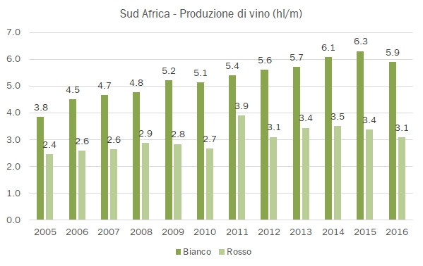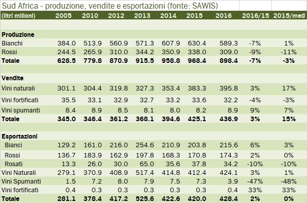 - Nel 2016 la produzione di vino sudafricana è stata di 9 milioni di ettolitri, in calo del 7% sul 2015 quando aveva toccato un livello di picco. Siamo circa il 3% sotto la media del quinquennio. Come vi dicevo prima, questo dato non include 0.4 milioni di ettolitri di vino per brandy, 1.2 milioni di ettolitri di vino che viene distillato e 0.35 milioni di ettolitri di vino che diventa succo di frutta. Tutti valori che andrebbero teoricamente corretti nella reportistica OIV.