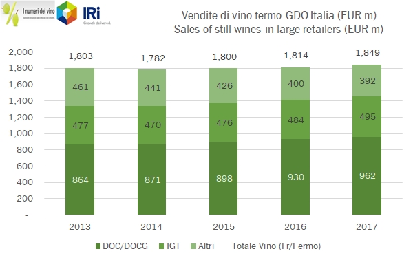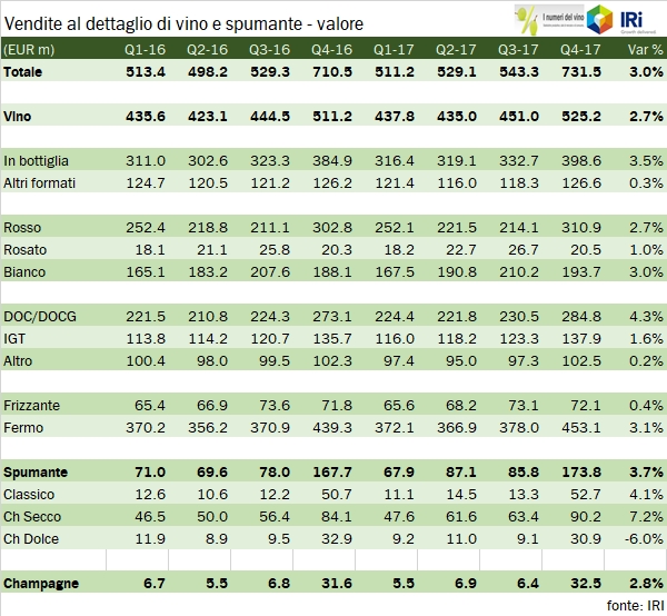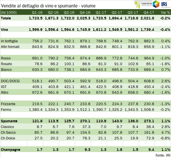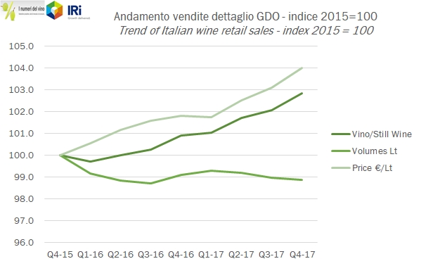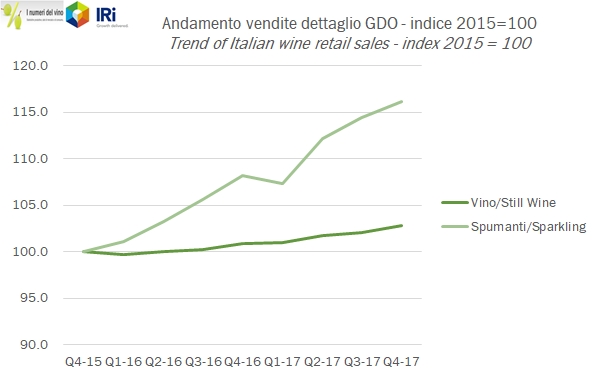 Le vendite di vino nella GDO italiana hanno mantenuto un passo del +3% circa anche nell’ultimo trimestre dell’anno, il più critico per il prodotto, particolarmente nel segmento degli spumanti. I volumi di vendita restano inchiodato allo zero-virgola, più o meno, e tutta la crescita viene dai prezzi (che si possono stimare in crescita dell’1-2% a seconda della categoria) e dal mix di vini fermi che si sposta verso i vini DOC/DOCG. Anche questo fine d’anno è stato caratterizzato dalla forte crescita degli spumanti, +7% (contro +2% per gli Champagne), dove il metodo “Charmat secco” (ovvero il Prosecco) e il “metodo classico” continuano a guadagnare peso. Riassumendo, il 2017 è un anno decisamente positivo per le vendite di vino e spumante nella GDO: il dato finale è 2.31 miliardi di euro, +2.8% per 7.6 milioni di ettolitri di vendite. Il dato copre quindi circa un terzo del consumo italiano di vino. Il 2018 si apre con delle forte incognite sui prezzi della materia prima vino, in forte crescita in seguito alla vendemmia molto scarsa del 2017. Tensioni sui prezzi si vedranno soprattutto sulla fascia bassa del mercato, quella dei vini da tavola, dove il prezzo medio è calato del 6% negli ultimi 3 anni, a fronte di un incremento del 5% e 7% rispettivamente per i vini IGT e DOC.
