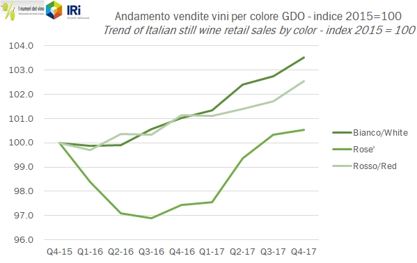 - La tendenza sulle tipologie di prodotto continua a premiare i vini bianchi, sui vini rossi e rosati, soprattutto nel computo dei volumi. Va detto che la stagionalità del vino bianco è più spinta sul terzo trimestre, mentre per il vino rosso il trimestre importante è il quarto.