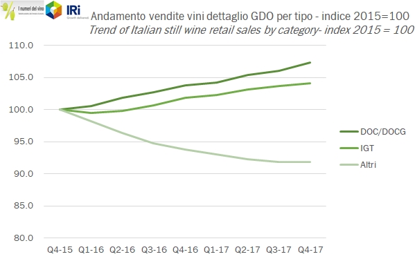 - Scavando nei segmenti, il dato molto positivo dei vini DOC/DOCG si conferma: nel quarto trimestre le vendite crescono del 4.3%, di cui +2.6% sono volumi, che porta il saldo annuo a 962 milioni di euro. Nel 2017 dunque il 52% del vino fermo venduto in GDO è DOC/DOCG, 4 punti percentuali in più del 2013. I vini IGT sono in leggero rallentamento, +1.6% nel trimestre e +2.3% nell’anno, essenzialmente a causa della debolezza dei volumi, mentre gli altri prodotti sono stabili nell’ultimo trimestre (-2% sull’anno) a fronte di un maggior effetto prezzo (mentre i volumi sono in discesa dell’1.6% sia nel fine anno che nell’intero anno).