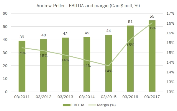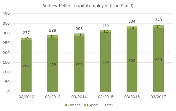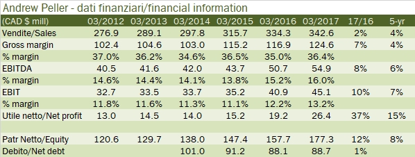 - Le vendite sono cresciute del 2% a 343 milioni di dollari a marzo 2017 (che di fatto è un 2016…), mentre hanno mostrato un trend di crescita molto costante del 4% circa sugli ultimi 5 anni. L’azienda opera in un mercato molto sano, il Canada ad esclusione della regione del Quebec di lingua francese, e questo la favorisce. Ha un’impronta decisamente domestica con il 96% delle vendite, dove copre tutte le fasce del mercato del vino.