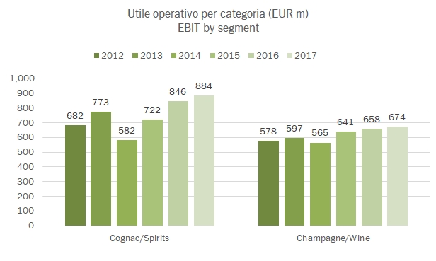 • Le vendite sono cresciute del 5% a 5.1 miliardi di euro, dopo un impatto negativo del 2% derivante dal rafforzamento dell’euro. Le vendite di Champagne e vini sono state 2.4 miliardi, in crescita del 5%, esattamente come l’andamento delle vendite di Cognac e spiriti. La conseguenza è un secondo semestre stabile, con un calo dell’1.5% delle vendite di Cognac e un incremento del 2% di quelle di Champagne.