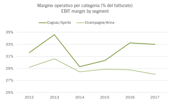 • I margini sono andati abbastanza male, anche se venivano da un periodo eccezionale. Nello Champagne/vini l’anno chiude con 674 milioni di utile operativo, +2%, con una riduzione del margine dal 29% al 28%. Nella divisione Cognac e spiriti le cose sono andate meglio soprattutto grazie al primo semestre, mentre nella seconda parte dell’anno i cambi hanno avuto un impatto piuttosto negativo.