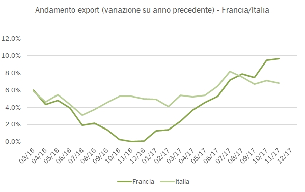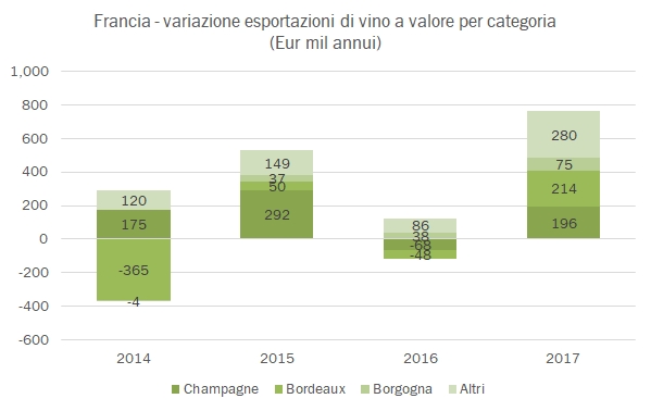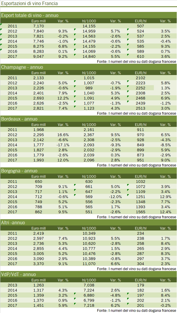- La categoria chiave resta lo Champagne, che chiude il 2017 con un buon +7.4% e 2.8 miliardi, che vengono dopo un 2016 leggermente calante (-2.5%). Poi vedremo tra qualche mese i dati puntuali del consorzio. 1.1 milioni di ettolitri esportati, +4%, record della storia recente, a un prezzo medio di 25.13 euro al litro, +3%.