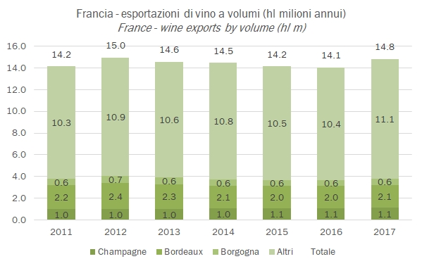 La Francia va un po’ “un anno si e un anno no” con le esportazioni, alternando anni stabili o leggermente calanti ad annate molto buone come è stato il 2017, con un bel +9% a 9 miliardi di euro, tre miliardi davanti all’Italia e 6 miliardi davanti alla Spagna. Non vale la pena richiamare sorpassi sull’Italia e via dicendo. Penso sia più importante considerare che, comunque, negli ultimi 5 anni la Francia è cresciuta mediamente del 3% e l’Italia del 5%. Dunque, resta vero che quest’anno i dati sono positivi, finalmente supportati da tutte e tre le “locomotive” francesi (Champagne, Bordeaux e Borgogna, in ordine di importanza). Forse la seconda cosa più interessante dei dati che presento oggi è la crescita dei volumi da 14.1 a 14.8 milioni di ettolitri, dopo 5 anni consecutivi di cali. Passiamo a guardare i dati insieme.