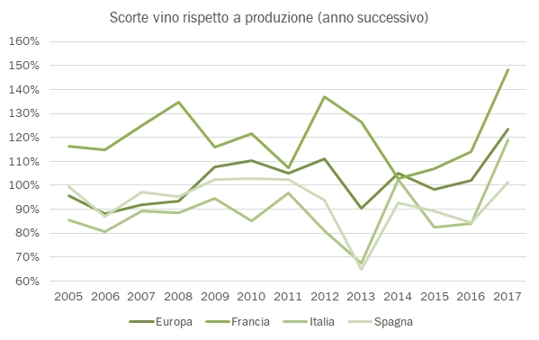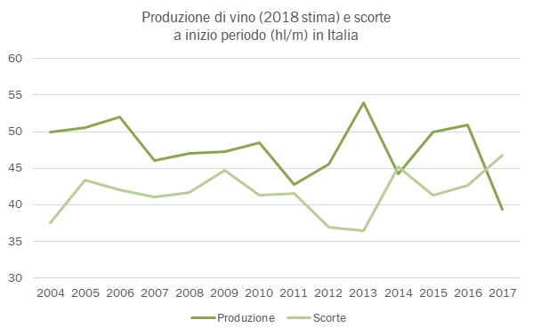 • Il livello delle scorte appare piuttosto elevato rispetto alla storia recente in Italia, con 47 milioni di ettolitri rispetto a una media di circa 42 degli ultimi 10 anni (presumibilmente da collegare anche a due vendemmie 2015 e 2016 molto generose). Stante una produzione attesa di 39-40 milioni di ettolitri nel 2018 rispetto alla media di 46-47, la situazione non sembra drammatica.