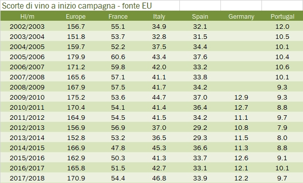 Il post di oggi recupera e aggiorna dei dati che avevo lasciato per diversi anni relativi alle scorte di vino. La domanda è ovvia: siamo a fronteggiare un anno di produzione molto inferiore alla media, ci saranno problemi scarsità di prodotto? Mettendo insieme i pezzi del mosaico sembrerebbe che la situazione non sia così drammatica a guardare il livello delle scorte a inizio campagna 2017, in Europa pari a 171 milioni di ettolitri, il livello più elevato dal 2010 a questa parte. Però come abbiamo letto qualche settimana fa i prezzi della materia prima vino sono esplosi, soprattutto nella fascia bassa del mercato, il che significa che non è corretto fare di tutta l’erba un fascio. Infine, terzo pezzo del mosaico, abbiamo letto che in Europa si spendono ancora centinaia di milioni di euro ogni anno per tagliare gli eccessi produttivi (e di scorte) attraverso contributi alle vendemmie verdi, distillazioni e via dicendo. Quindi, forse la produzione scarsa del 2017/18 non va vista in modo totalmente negativo. I dati qui esposti mettono in luce una specie di “deriva” alla crescita delle scorte che si normalizzerà nel corso dell’anno. L’Italia in particolare detiene il 27% del vino immagazzinato a inizio campagna, contro il 32% della Francia. Le scorte italiane sono molto superiori alla media storica, con un margine che sembrerebbe piuttosto simile al deficit produttivo dell’ultima annata. Passiamo all’analisi dei dati con qualche considerazione sui singoli paesi.