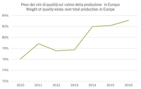 - Infine, forse il grafico più interessante dove si legge il peso dei vini di qualità sul totale, passato dal 78% del 2012 all’83% del 2016.