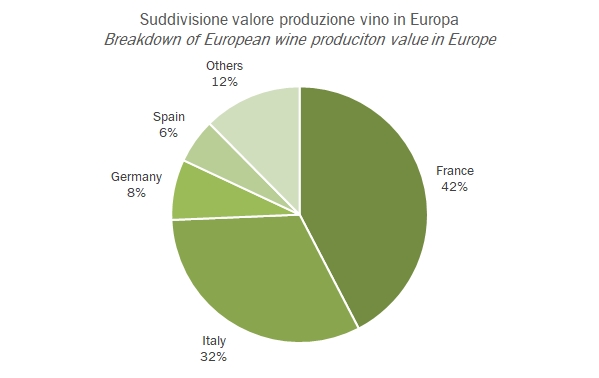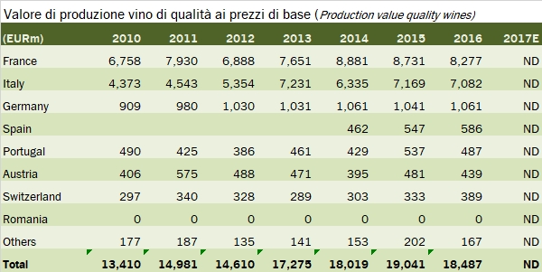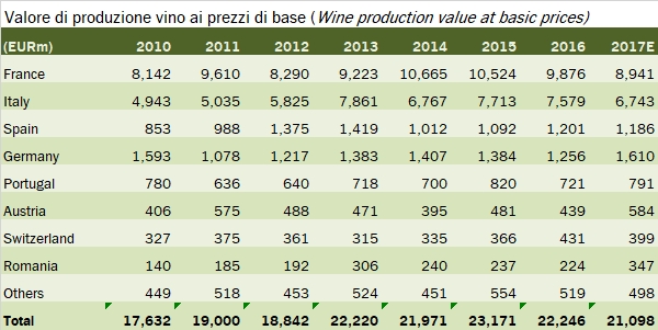 - Secondo Eurostat, il valore della produzione del 2017 di vino è stimato in Europa a circa 21 miliardi, in calo del 5% sul 2016, che a sua volta era sceso del 4% dal picco del 2015.