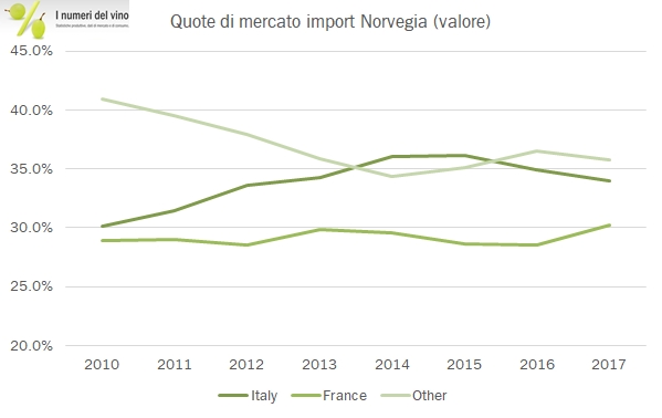 Come già visto nel mercato americano, anche in Norvegia il vino francese riguadagna posizioni (+10%), pur restando leggermente sotto rispetto alle nostre esportazioni (+1%), che pure non sono andate così male. Non è necessario che vi spieghi quanto sia interessante e in salute il mercato norvegese, dove un mix di redditi elevati e cultura “europea” determinano un buon consumo di vino (quasi 850mila ettolitri), soprattutto con un mix particolarmente ricco (oltre 4 euro al litro all’importazione). Il 2017 è stato poi un anno di crescita (4% in euro e 5% in valuta locale), nonostante i volumi importati siano leggermente calati (-3%). Naturalmente, non essendo presente una produzione locale, vino importato = vino consumato, quindi potremmo anche chiamare questo post “consumo apparente di vino in Norvegia”. Ma passiamo ai dati.