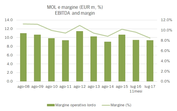 - I margini sono calati. Nosio ha generato 16.2 milioni di valore aggiunto, 9.4 milioni di margine operativo lordo e 5.4 milioni di utile operativo. Il MOL è stabile mentre l’utile operativo cala del 3% nonostante la diversa base di comparazione. Il margine cala dal 16% al 14.6% a livello di MOL e dal 5.7% al 4.9% a livello operativo. A determinare tale andamento due cose: primo, il calo dei contributi da 1.7 a 0.4 milioni di euro; secondo, l’aumento del 10% circa del costo del personale a 6.7 milioni di euro.