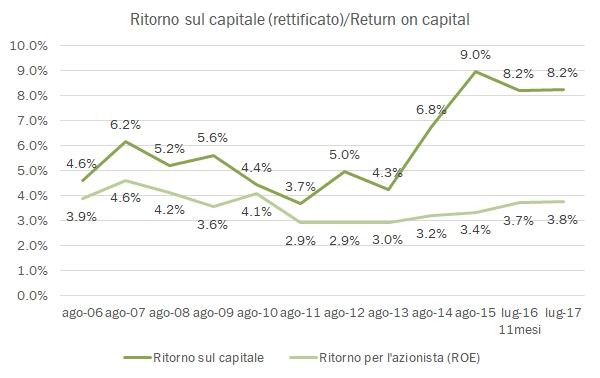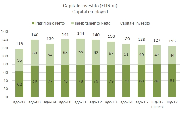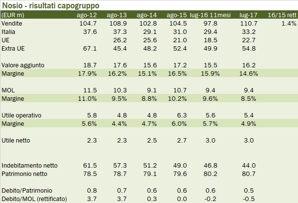 - La parte finanziaria vede un ulteriore calo della leva. Vi ricordo che Nosio fa un bilancio d’esercizio e non consolidato e quindi ha un valore di circa 49 milioni di euro nelle controllate che andrebbe detratto dal debito. Il debito a fine anno scende da 47 a 44 milioni di euro, a fronte di un piccolo progresso del patrimonio netto (il 90% dell’utile è distribuito come dividendo alla capogruppo Mezzacorona). Ad aiutare Nosio nel 2017 è stato il calo di circa 2 milioni di euro del capitale circolante e l’ammontare molto esiguo di investimenti, scesi sotto il livello d 1 milione rispetto ad ammortamenti di circa 4 milioni di euro.