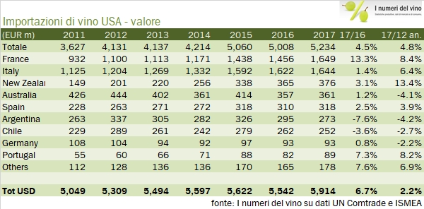 • Le importazioni di vino in USA nel 2017 sono cresciute del 4.5% a 5234 milioni di euro, a fronte di un incremento dei volumi dell’8% a 12.1 milioni di ettolitri.