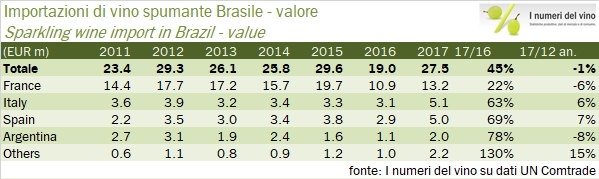 • Chiudiamo con un breve sguardo ai vini spumanti in Brasile. La leadership della Francia è salda con 13 milioni su 27 totali, e una crescita del 22%. Ma il mercato cresce del 45% nel 2017: sono i vini spumanti italiani e spagnoli (5 milioni di euro per entrambi) a guadagnare quote di mercato, mentre per i prodotti francesi il dato positivo dell’anno passato si innesta su un trend particolarmente negativo degli anni precedenti. Speriamo sia un buon segno anche per il 2018!