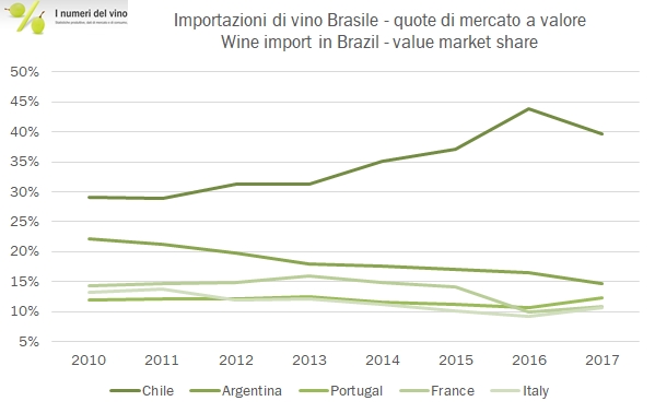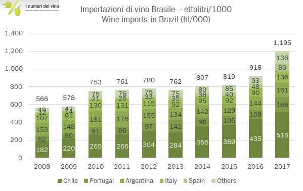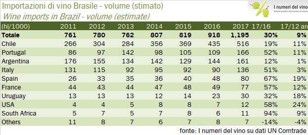 I dati che commentiamo oggi sono per certi versi sorprendenti. Il Brasile è un mercato dove per diversi anni ci si sarebbe aspettato un andamento molto positivo, anche in relazione ai numerosi eventi “mondiali” che si sono tenuti (Olimpiadi nel 2016, Mondiali di calcio nel 2014). In realtà in quegli anni, anche a causa del cambio non si sono visti grandi progressi. Il 2017 è stato invece diverso. Le importazioni sono cresciute del 29% a 328 milioni di euro, in parte grazie anche al cambio. In valuta locale i brasiliani hanno comperato il 20% di vino in più. Non solo. L’incremento del 2017 è stato soprattutto generato da un balzo dei produttori del vecchio mondo (Francia, Italia e Spagna) mentre i partner storici Cile e Argentina, pur crescendo hanno visto ridursi la loro quota di mercato. Con 1.2 milioni di ettolitri, +30%, il Brasile resta un mercato con un enorme potenziale e l’Italia non sembra essere male posizionata, considerando che il nostro export è circa simile a quello francese. Speriamo sia un buon segno per gli anni a venire. Passiamo ai dati.