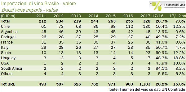 • Le importazioni di vino in Brasile sono cresciute del 29% a 328 milioni di euro, che corrispondono a 1.18 miliardi di Real (+20%). In un orizzonte di 5 anni, il mercato è cresciuto del 15% annuo in Real e del 7% annuo in euro.