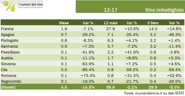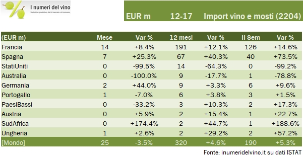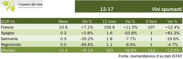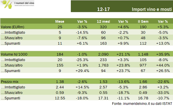 - Il dato finale di 320 milioni segnala un incremento del 4.6% sul 2017, con una leggera accelerazione del secondo semestre, +5.3% a 190 milioni. A questo dato contribuiscono soprattutto i vini spumanti, in crescita del 10% a 163 milioni (+13% nel secondo semestre), mentre i vini in bottiglia calano del 2% a 60 milioni (-5% nel secondo semestre) e il resto delle importazioni (quindi sfusi, mosti e altro) sono stabili a 96 milioni (-3% nel secondo semestre).