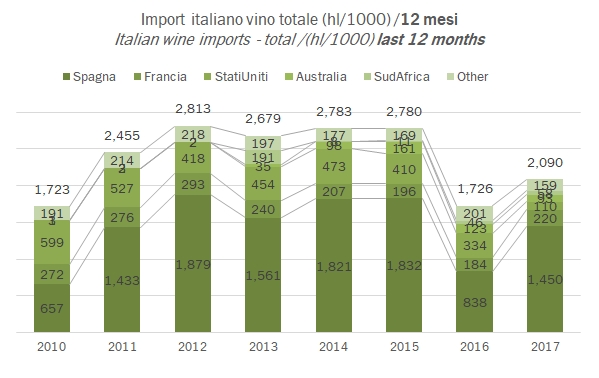 Come ben sappiamo l’importazione di vino in Italia ha una connotazione “macroeconomica”. Salvo un prodotto, lo Champagne, che importiamo in abbondanza perché ci piace e un pochino di importazione di vini fermi sempre francesi, tutto il resto è vino di bassa qualità che compriamo quando manca il nostro. Naturalmente sto parlando di grandi numeri e non di nicchie del mercato, giusto per mettere il discorso sui giusti binari. Però i numeri sono questi: 320 milioni di importazioni, di cui 60 sono vini in bottiglia (e di questi 28 sono francesi) e 156 milioni sono vini spumanti (156 sono francesi). Proprio la parte restante, quindi il vino di cui abbiamo bisogno sta accelerando, stante la vendemmia molto scarsa del 2017, dopo due anni piuttosto scarsi (quando la nostra vendemmia fu molto abbondante). Quindi l’export fa un po’ la fisarmonica. I 320 milioni di euro del 2017 sono molto vicini ai 310 circa medi degli ultimi 10 anni, e lo stesso largo circa vale per i 2.1 milioni di ettolitri importati: si confrontano con una media di 2.2 milioni tra il 2017 e il 2016. Il 2018 probabilmente sarà un anno di accelerazione, vista la scarsità della nostra vendemmia. Passiamo ai dati.