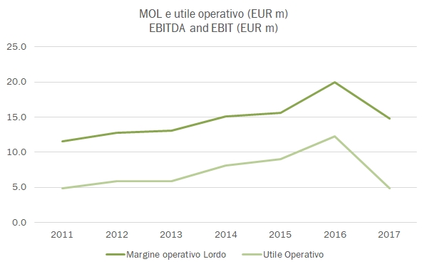 - I margini scendono rispetto allo scorso anno, quando però il gruppo ha goduto di 5 milioni di euro di proventi straordinari a livello di MOL. Ad ogni buon conto, anche togliendo i 5 milioni dal 2016 il margine sarebbe sceso dal 6.2% al 5.9% del 2017, con un andamento in valore assoluto perfettamente stabile. Sotto, a differenza degli anni passati, crescono gli ammortamenti perché il perimetro dell’attività cresce e quindi l’utile operativo scende sotto quota 5 milioni, mentre grazie a 1 milione di crediti fiscali l’azienda chiude con 4.3 milioni di euro di utile netto.