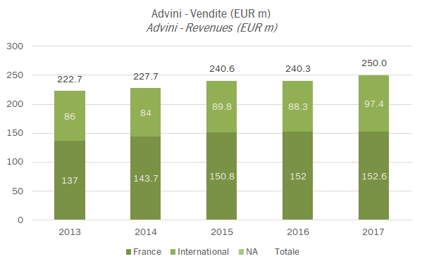 Il secondo semestre di Advini è andato come, se non peggio, del primo e quindi le conclusioni che si potrebbero trarre dal post di oggi sono sovrapponibili a quelle dello scorso novembre relativamente ai dati del primo semestre. Ci sono progressi, naturalmente: le vendite dei prodotti “propri” rispetto a quelli distribuiti di terzi cresce al 34% del totale e in percentuale del 24% e le acquisizioni continuano con l’operazione su Stellenbosch Vineyards in Sud Africa (10 milioni di vendite e un margine EBITDA tra il 12% e il 15%), che va a completare il posizionamento del gruppo nel paese. A ciò comincia però ad aggiungersi qualche dismissione, perché la situazione finanziaria sta diventando preoccupante, con 168 milioni di debito a fronte di 15 milioni di MOL… per cui si sono stati venduti vigneti e cantine per 6-7 milioni di euro. Ricapitolando il piano al 2020: vendite di 500 milioni di euro, e siamo lontanissimi a 250; proporzione marche proprie al 50% sul totale, e qui ci si potrebbe arrivare, siamo al 34% nel 2017 e il fatturato cresce velocemente in seguito alle acquisizioni; ultimo, un margine MOL del 10% rispetto al 6% attuale, che non da segni di migliorare nonostante il miglioramento evidente del mix di fatturato (da marchi di terzi a marchi propri, da grande distribuzione a clientela tradizionale e HoReCa, oltre a vendita diretta). Mah, i dubbi aumentano. In borsa, sul titolo, calma piatta… veleggia a 35 euro per azione da ormai un anno a questa parte. Per ora andiamo a studiare qualche dato sul 2017.