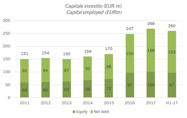 - La parte finanziaria come dicevamo peggiora. Il debito sale da 150 a 168 milioni di euro. La generazione di cassa dell’attività è stata quasi nulla nel 2017, a causa di un assorbimento di capitale circolante di 9 milioni (magazzino principalmente). Quindi i 18 milioni di crescita del debito derivano da 1 milione di dividendi, 14 milioni di investimenti e 3 milioni di acquisizioni, per dare un’idea di massima. Confrontato con un MOL di 15 milioni, siamo a un rapporto di oltre 10x, molto elevato anche se bisogna sempre considerare che l’azienda ha 125 milioni di euro di attività tangibili (di cui una sessantina in terreni) a “proteggere” i creditori.