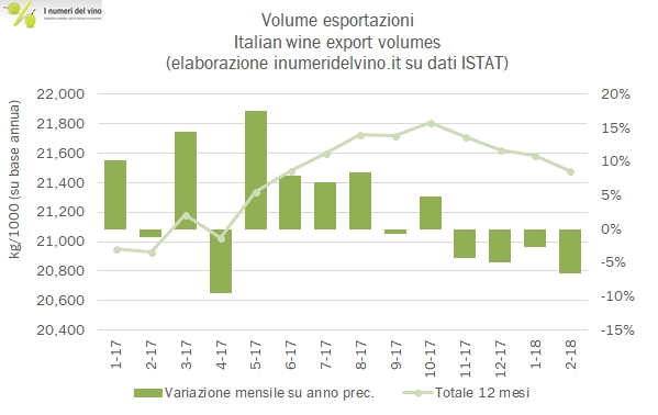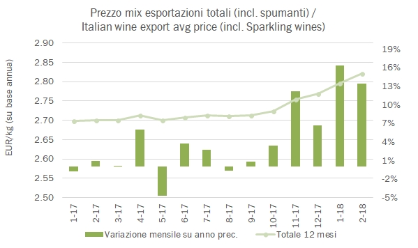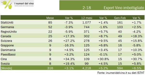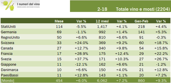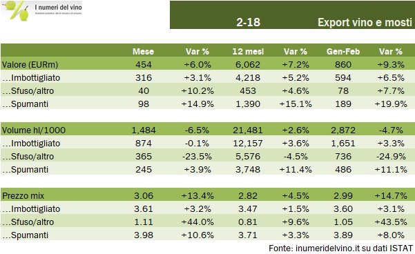- Febbraio chiude con 454 milioni di export e una crescita del 6%, per un volume di vino esportato di 1.48 milioni di ettolitri, dunque in calo del 6%. Ne risulta un incremento del 13% del prezzo mix che si porta nel mese a 3.06.