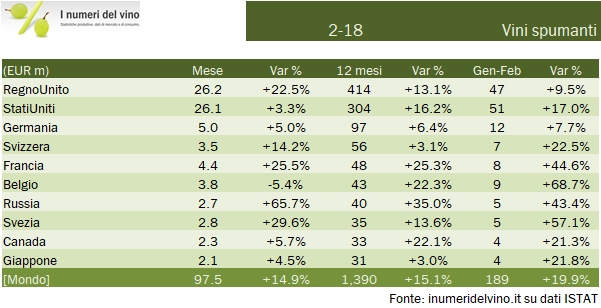 - I mercati dei vini spumanti sono stati tutti in crescita nel bimestre: +10% il Regno Unito, +17% gli Stati Uniti, +8% la Germania, +22% la Svizzera e, come dicevamo sopra, +44% la Francia.