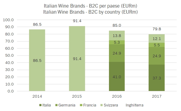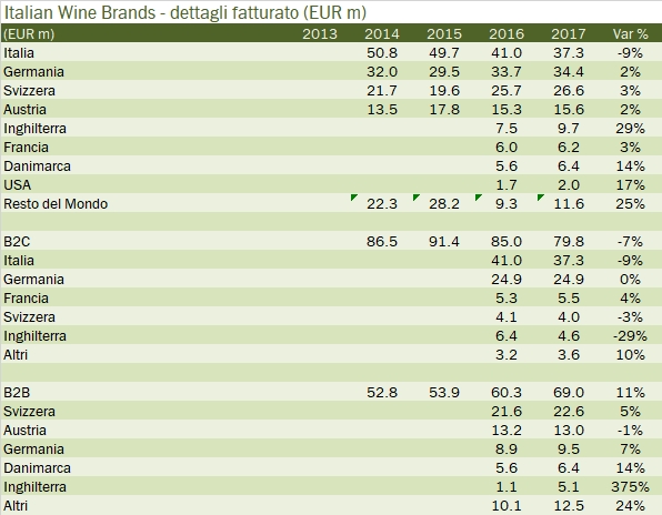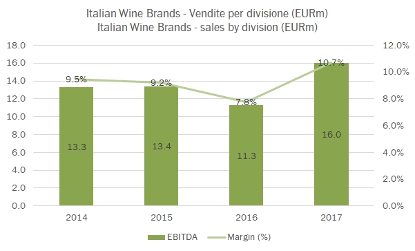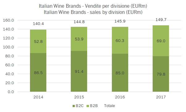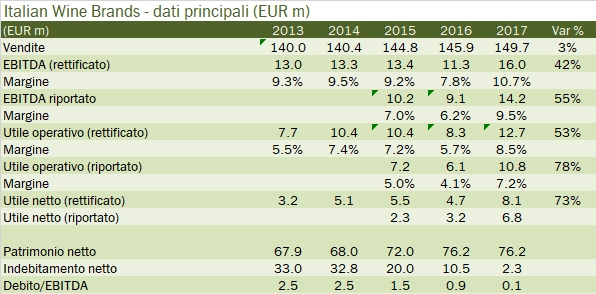 Italian Wine Brands ha centrato nel 2017 una serie di traguardi: ha azzerato il debito, sceso da 33 milioni di euro a 2 (anche grazie all’aumento di capitale del 2015, ma la generazione di cassa è stata positiva) e ha rimesso in carreggiata il conto economico con un taglio di costi e una riorganizzazione dell’attività della Giordano Vini. Il 2017 si chiude quindi con 150 milioni di ricavi, un dato non distante da quello degli ultimi anni, un EBITDA rettificato risalito a 16 milioni di euro (14 milioni dopo gli oneri straordinari) e un utile netto rettificato per gli oneri straordinari di 8 milioni di euro (6 quello dichiarato). Un problema non è ancora stato risolto: le due anime della società continuano a viaggiare in senso opposto: cresce la parte B2B della Provinco, +11% nel 2017, con una proiezione completamente estera, e cala del 7% l’anima B2C della Giordano Vini, pur con margini in forte ripresa, alle prese con un l’andamento negativo del mercato italiano (-9%) ma anche con la difficoltà a far funzionare il modello all’estero, come in Svizzera, in Inghilterra e in Germania. Tutti mercati dove l’andamento è altalenante. L’azienda ha oggi ha un valore di mercato 92 milioni di euro (circa 14 euro per azione) ed è cresciuta di oltre il 40% negli ultimi 12 mesi, riscattando un periodo iniziale piuttosto negativo. “Tratta” dunque a un multiplo di poco più di 11 volte gli utili e circa 8 volte l’utile operativo, uno dei valori più bassi del mercato, ma deve ora superare l’esame della crescita, sia per via interna (compensando e rinvigorendo la parte B2C) e mettendo in pratica una strategia volta a continuare a crescere nei mercati esteri ma anche ad aggiungere nuovi brand al portafoglio, magari attraverso acquisizioni. Passiamo a commentare i dati.