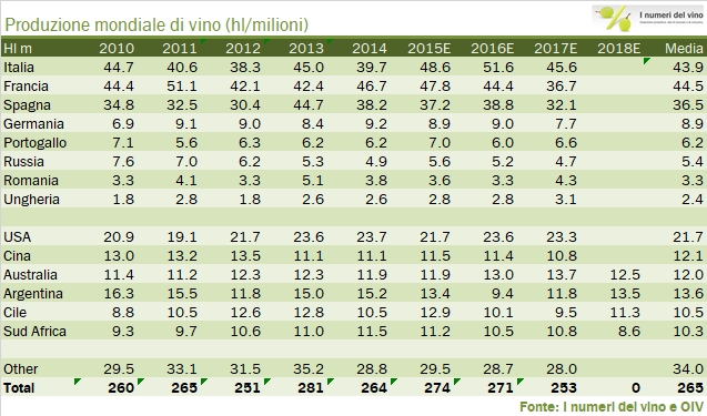 Nella conferenza stampa di fine Aprile OIV ha prodotto dati sulla produzione 2017 di vino aggiornati con delle risultanze più precise rispetto a quelle di Ottobre. Come sempre, ove possibile, correggiamo questi dati per i numeri puntuali che raccogliamo da Italia, Francia e Spagna dai relativi siti. Ne consegue una leggera differenza, circa 3 milioni di ettolitri, da 250 (OIV) a 253 milioni (dati pubblicati qui), che essenzialmente sono legati alla prima stima ISTAT di produzione di vino di 45 milioni di ettolitri (quindi ben più elevata di quella di 38 inizialmente prevista e un po’ più alta dei 42.5 milioni di ettolitri segnati da OIV nel suo documento). In tutti i casi si tratta di una vendemmia molto scarsa, come si sapeva, dove a mancare è la produzione europea, in calo di 20 milioni di ettolitri (ma comunque in media rispetto ai dati degli ultimi 10 anni), mentre il resto del mondo, a poco più di 110 milioni di ettolitri resta sopra le medie storiche (intorno ai 100) ma decisamente sotto al dato record segnato nel 2013 di 121 milioni di ettolitri. OIV mette poi anche qualche numero sul 2018, che trovate in tabella per l’emisfero sud del mondo, dove per Australia e Argentina si rileva un “ritorno alla normalità” dopo una produzione rispettivamente altissima e bassissima. Per il Cile e per il Sudafrica vale la medesima dicotomia: meglio per il primo, molto male per il secondo. Passiamo ai dati.