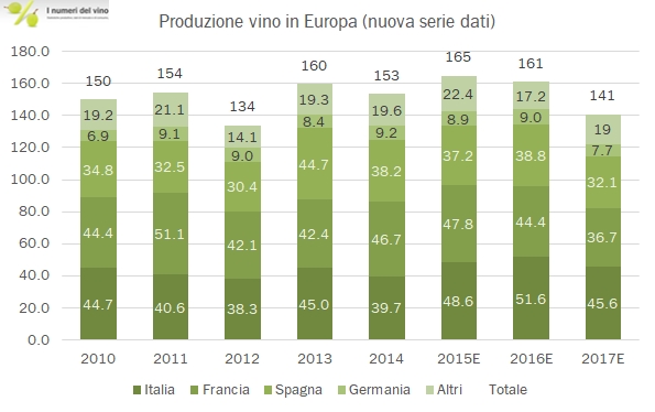 • In questo contesto, data la scarsa produzione francese (sotto 37 milioni di ettolitri, il dato peggiore di sempre, probabilmente) e spagnola (32 milioni di ettolitri, soltanto nel 2012 si produsse di meno), l’Italia mantiene una leadership di volumi, che sappiamo non si replica quando si passa dai litri di vino agli euro.