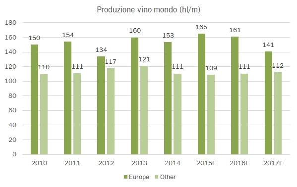 • Secondo OIV la produzione mondiale di vino scende nel 2017 a 250 milioni di ettolitri, il 9% in meno rispetto al 2016 con una perdita di circa 24 milioni di ettolitri. Rettificando il dato italiano secondo le ultime risultanze ISTAT (aggiornamento novembre 2017), si arriva a un dato leggermente superiore, 253 milioni di ettolitri, contro un dato 2016 un po’ più basso di quello che dice OIV, di circa 271 milioni di ettolitri. Quindi la nostra stima è di una perdita del 7% e di circa 18 milioni di ettolitri.