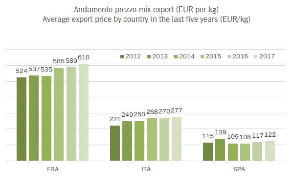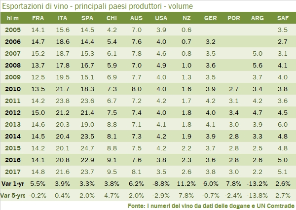 • La Francia ha avuto un anno eccellente come abbiamo già commentato nel post di riferimento. Le esportazioni crescono del 9%, ben più della media quinquennale del 5%. A determinare l’accelerazione è la ripresa dei volumi, passati da 14.1 a 14.8 milioni di ettolitri, +5.5%.