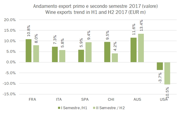 Il trade mondiale di vino ha vissuto un’ottima annata nel 2017, a differenza della produzione di vino! Le esportazioni degli 11 maggiori paesi del mondo segna una crescita del 7% a 27 miliardi di euro. Il dato è leggermente diverso da quello riportato da OIV nella sua conferenza stampa, dove si parla di una crescita del 5% a 30 miliardi di euro. La differenza deriva dal fatto che OIV già considera tutti gli altri paesi, la maggior parte dei quali sono guidati dal dollaro americano. Essendosi questo svalutato, è piuttosto probabile che ci sia stato un calo negli altri paesi del mondo. I cambi sono senz’altro una chiave di lettura di questi dati: la svalutazione del dollaro americano ha avuto un impatto negativo sull’andamento delle esportazioni USA, soprattutto nel secondo semestre (vedere grafico allegato). Le altre note evidenti sono però relative alla ripresa delle esportazioni in volume, +3.5% a 98 milioni di ettolitri (e su questo dato OIV è perfettamente allineata, +3.4% a 108 milioni, a riprova che la questione cambi ha un impatto sul resto del mondo), con un dato molto positivo dell’export francese, che era in calo da diversi anni quanto proprio ai volumi. Questa è un po’ la lettura del 2017, dove l’Italia soffre il fatto che non ha avuto il medesimo spazio di far crescere i volumi dei francesi e dunque, per quest’anno non guadagna quota di mercato. Infine, vi segnalo la forte ripresa delle esportazioni australiane (leggi Cina) e il calo degli USA di cui abbiamo detto sopra. Sembra infine attenuarsi la crescita della Nuova Zelanda, che resta incredibilmente la settima forza dell’export nel mondo, ancora una volta sopra il miliardo di euro. Passiamo ai dati.