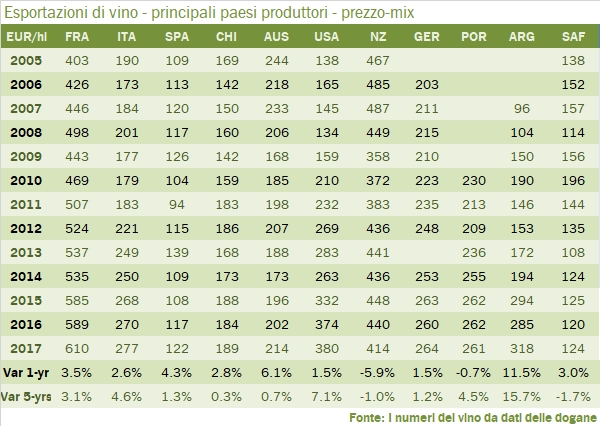 • Le esportazioni di vino crescono del 7% a valore e del 3.5% a volume nel 2017 per i primi 11 paesi esportatori, per un valore assoluto di 27 miliardi e 98 milioni di ettolitri. Trasposta su base quinquennale, la crescita diventa del 3.4% per il valore e dello 0.6% annuo per il volume. Ne consegue un prezzo mix mondiale di circa 275 euro per ettolitro, in crescita del 3% sul 2016, lo stesso ritmo degli ultimi 5 anni.