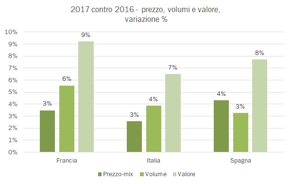 • La Spagna sfiora l’8% di crescita a 2.9 miliardi fortemente sospinta dal prezzo mix, oltre il 4%.
