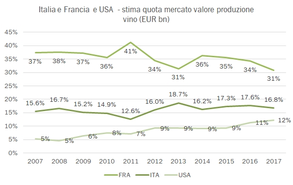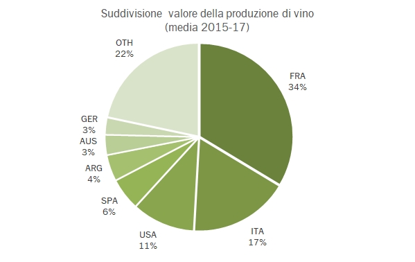- La Francia è il leader indiscusso. Nel 2017 la produzione è calata del 19% ma i prezzi sono cresciuti del 3.5%, determinando un calo del 16% del valore di produzione a 22.4 miliardi di euro, leggermente sotto la media storica 2008-2017.
