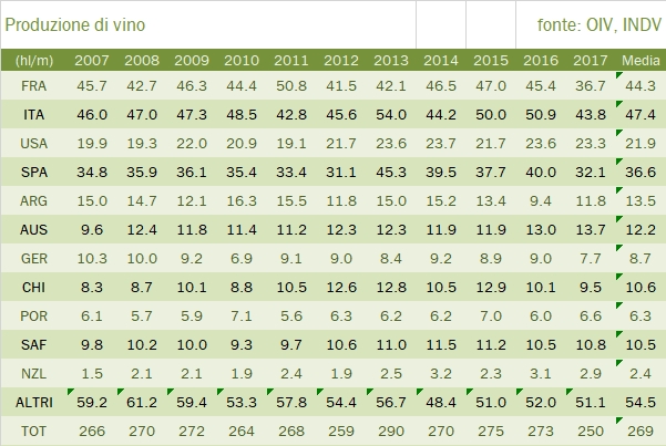- È andata meglio per l’Italia, che secondo ISTAT ha prodotto 43.8 milioni di ettolitri di vino (dato questo molto discusso per la sua possibile sovrastima del volume), -14%, e ha segnato un progresso del 2.6% dei prezzi, giungendo dunque a 12.1 miliardi di euro di valore della produzione, -12% ma il 12% sopra la media storica.